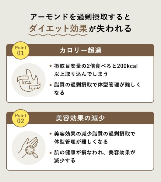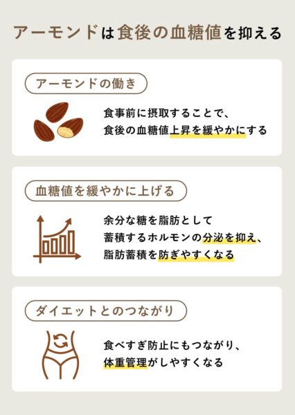 また、血糖値が急激に上がったあと急降下する時に強い空腹感や甘いものへの欲求が高まる「血糖値スパイク」を防げるため、ドカ食いの抑止につながる。結果、アーモンドを摂取することで体重管理がしやすくなり、ダイエット効果の向上につながる。