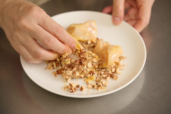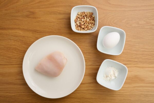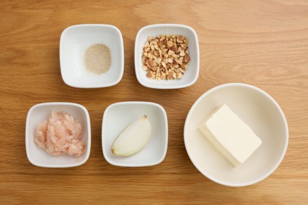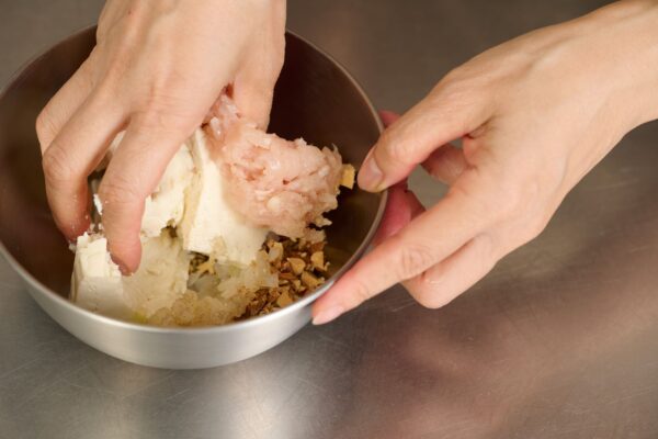 ③豆腐は水切りし、鶏ひき肉・玉ねぎ・砕いたアーモンドと混ぜる |