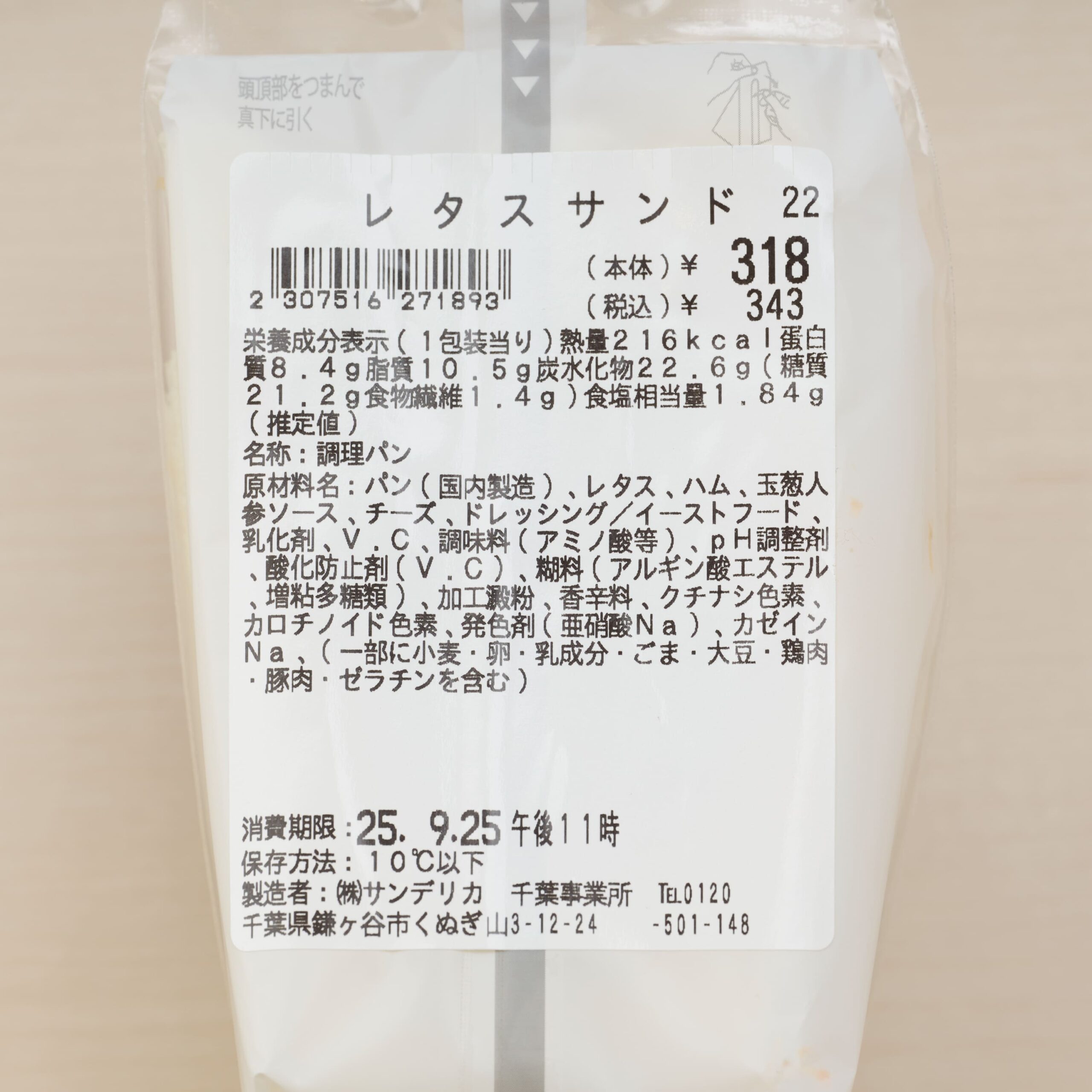 ローソン 【商品名】レタスサンド 【価格】343円 【糖質・カロリー】糖質:21.2g / カロリー:216kcal |