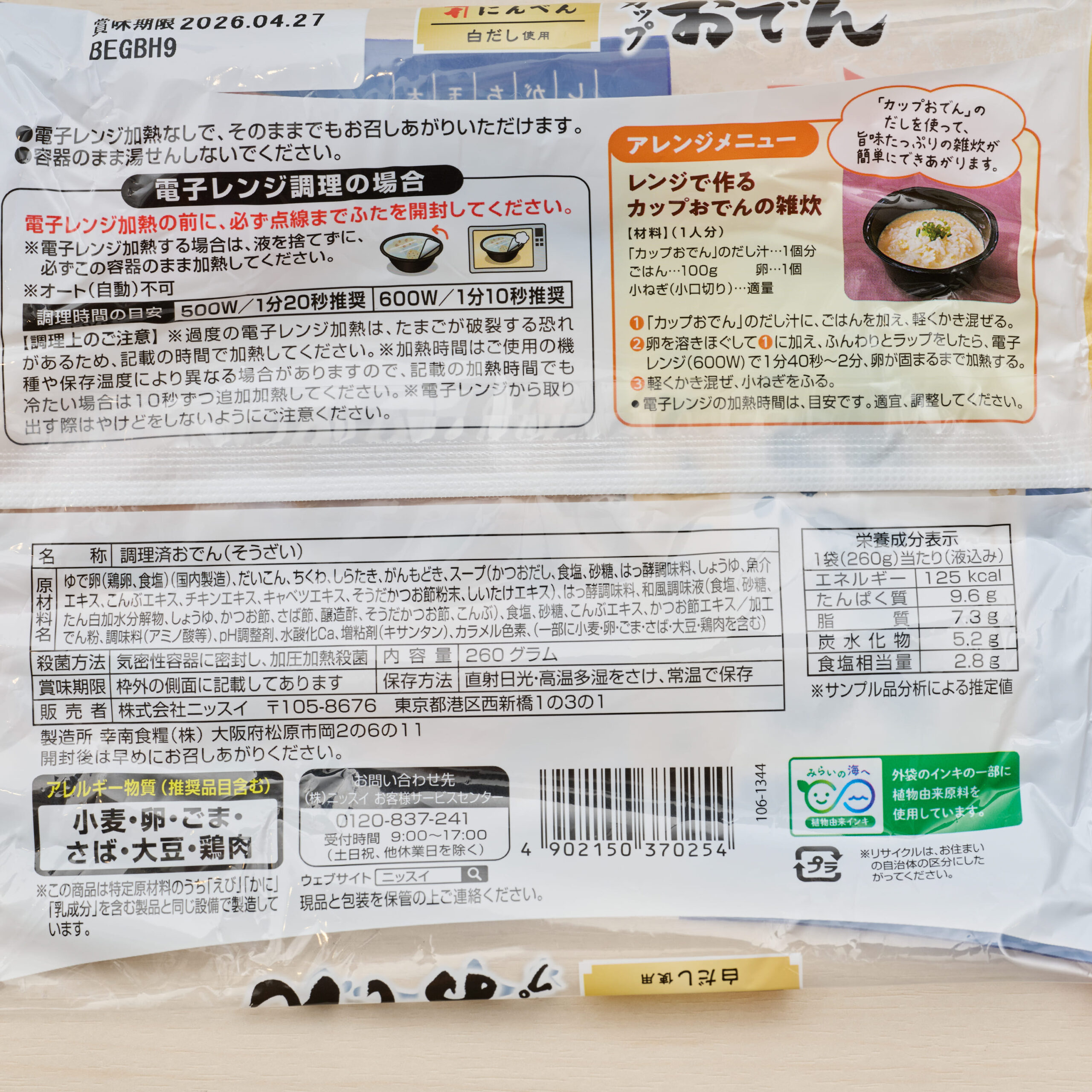 ファミリーマート 【商品名】和風だし香るおでん 【価格】320円 【糖質・カロリー】糖質:11.5g / カロリー:150kcal |
