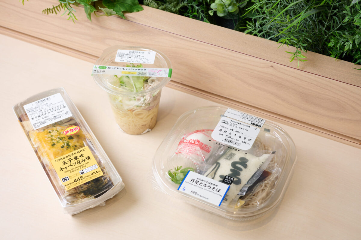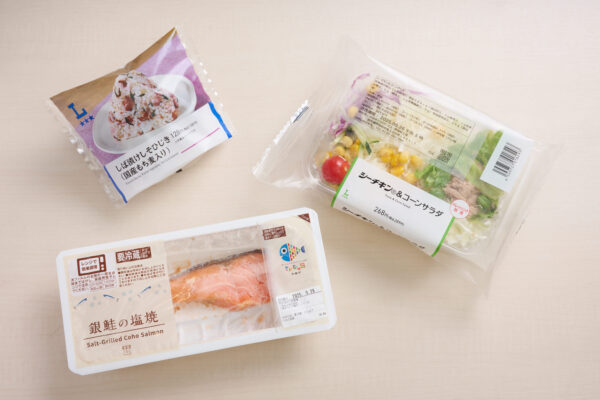 コンビニでの食事は、単品だけで済ませると炭水化物や脂質に偏りやすくなります。そこで、おにぎり+サラダチキン+海藻サラダといったように、主食・主菜・副菜を意識して組み合わせることが大切です。