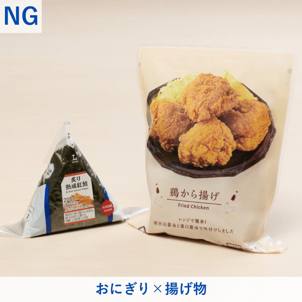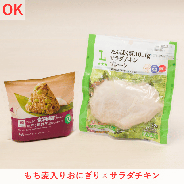揚げ物とおにぎりの組み合わせは食べ応えがある反面、高脂質・高カロリーで血糖値も上がりやすいため、ダイエット中は気をつけたい組み合わせです。代わりに、サラダチキンと大麦入りのおにぎりを選ぶと、たんぱく質と食物繊維を同時にとることができ、満腹感が持続しやすくなります。こうした工夫により栄養バランスが整いやすくなり、間食を防ぎつつ代謝の維持にもつながります。
