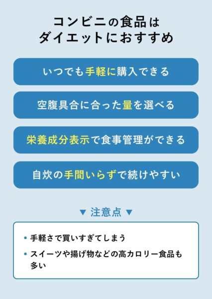 コンビニの魅力は、いつでも気軽に利用できる点。朝食を準備する余裕がないときや、残業で夕食が遅くなる日でも、コンビニを活用すれば無理なく食事を整えることが可能。さらに、空腹の時間を長引かせないことはダイエットを成功させるポイントのひとつだが、コンビニ食品なら空腹の程度に合わせて量を選べるため安心。間食や軽食を上手に取り入れることで血糖値の急激な上昇を抑えられ、食べ過ぎの防止にも役立つ。特に夕食が遅くなりそうな日は、軽めの食品を買って「分食」する方法もおすすめ。