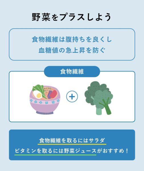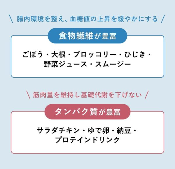 - 食物繊維やタンパク質が豊富な食品も意識する