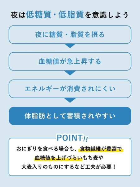 夜は活動量が少ないため、高糖質や高脂質の食事を摂るとエネルギーが消費されにくく、身体に脂肪として蓄積しやすいといわれています。さらに、血糖値が急激に上昇すると睡眠の質に悪影響を及ぼすこともあります。