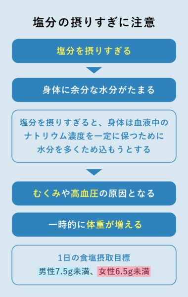 塩分を摂りすぎると、身体に水分がとどまりやすくなり、一時的に体重が増えたり、むくみにつながったりすることがあります。しかし、適切な量であれば身体の調子を保つために欠かせない栄養素でもあります。