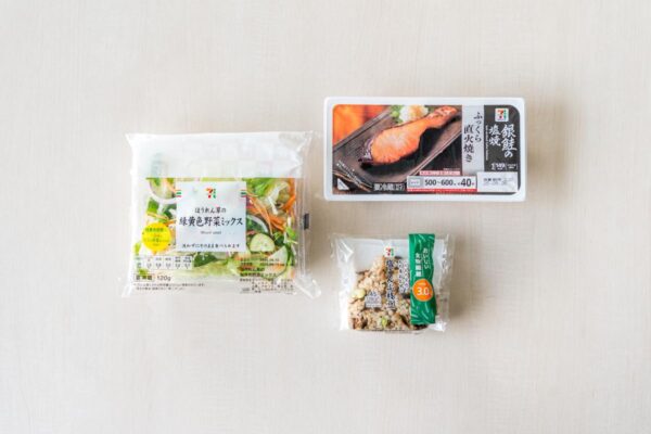 コンビニ食は単品で選ぶと、炭水化物や脂質に偏りやすくなります。そのため、おにぎり+サラダチキン+海藻サラダといったように、主食・主菜・副菜をそろえることが大切です。
