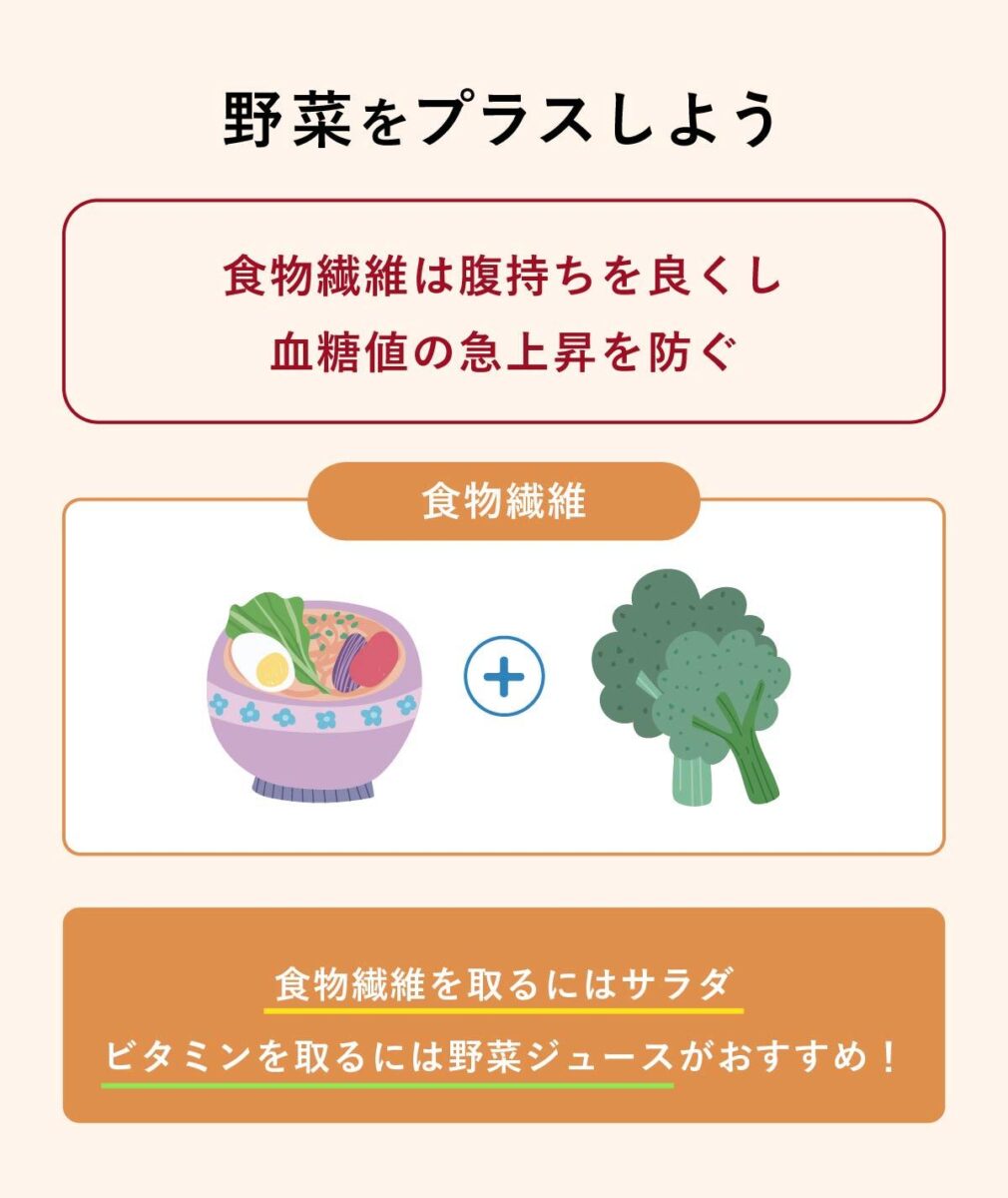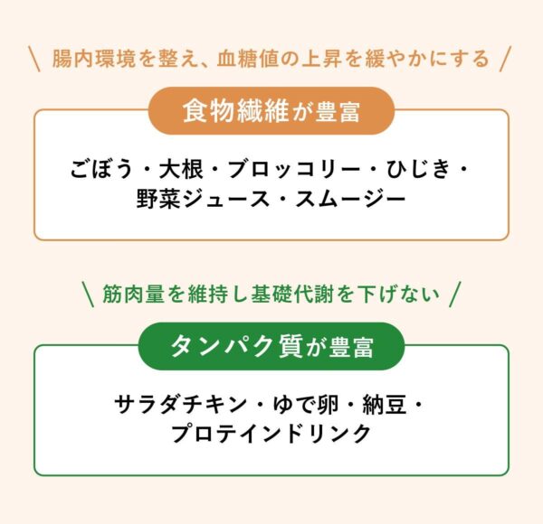 - 食物繊維やタンパク質が豊富な食品も意識する