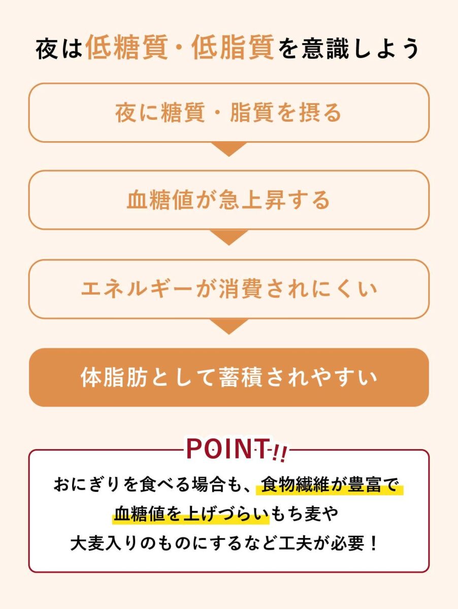 - 夜は「糖質15〜20g/脂質8g未満」を目安に