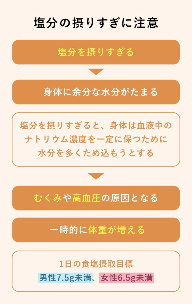 塩分を多く摂ると体内に水分が残りやすくなり、一時的な体重増加やむくみにつながることがあります。ただし、適量であれば体調を維持するために欠かせない栄養素でもあります。