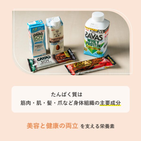 タンパク質は筋肉だけでなく、肌・髪・爪など身体組織の主要成分であり、不足すれば美容や健康の面で不調が出やすい。高齢期のフレイル予防や、加齢に伴う筋肉量低下を防ぐ観点からも、タンパク質摂取は大切。