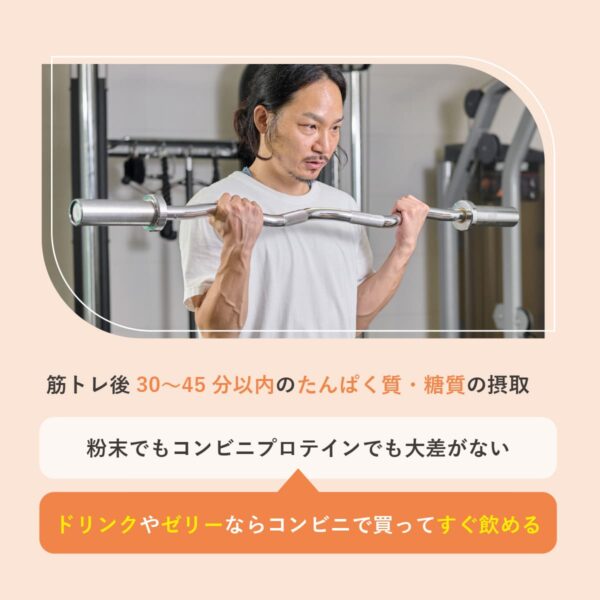 筋トレ後は「ゴールデンタイム」と呼ばれる30〜45分以内にタンパク質と糖質を摂取することがおすすめ。