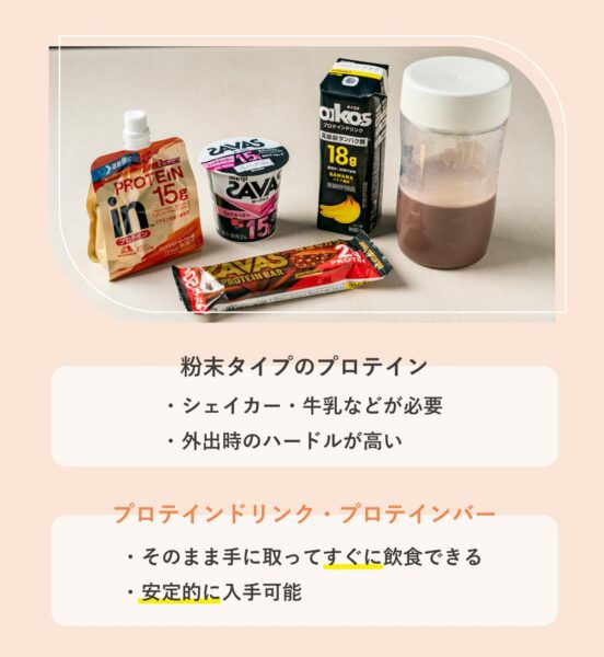 粉末タイプのプロテインは必要に応じてタンパク質量を調整できるが、シェイカー・牛乳などが必要であり、外出時にはハードルが高い。その点、コンビニで売られているプロテインドリンクやバーはそのまま手に取り、すぐに飲食できる点が大きな利点。