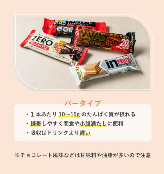 バータイプは、1本で10〜15g程度のタンパク質を摂取できる固形食品。携帯性に優れ、噛むことで満足感が得られるため、間食や小腹満たしとして便利。