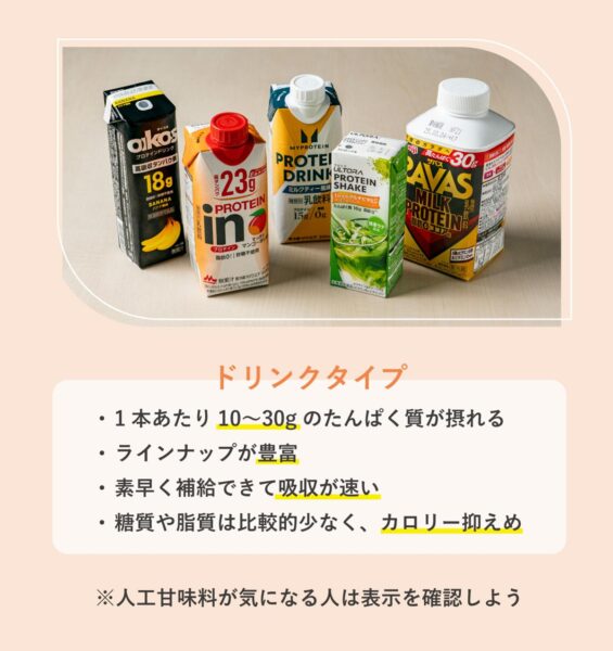 ドリンクタイプは、摂取タイミングを選ばない万能タイプです。特に運動直後や忙しい朝など、時間をかけずにタンパク質を補いたいシーンに最適。液体のため吸収が早く、リカバリー目的の利用にも非常に効果的です。
