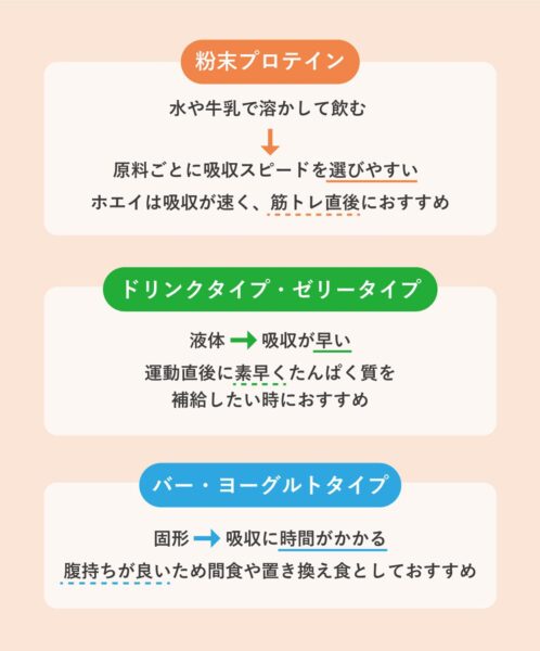 一方、コンビニのドリンクタイプも液体であるため吸収は早い。ゼリータイプも同様で、運動直後に素早くタンパク質を補給したい場面に向いている。