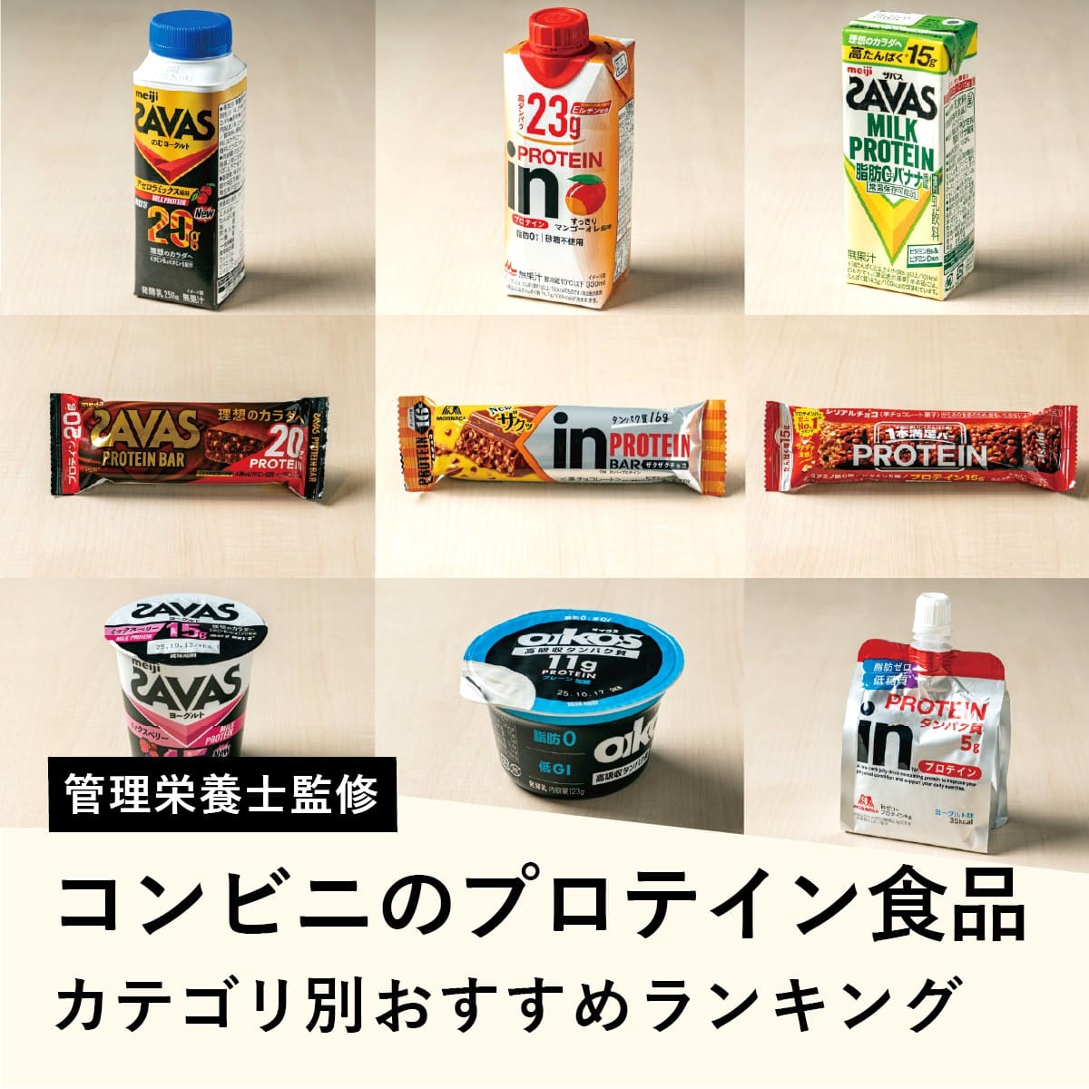 タンパク質を手軽に摂取できる「コンビニのプロテイン商品」。粉末のような準備いらずで、必要なときに必要量をプラスできるのが特徴。今回は実際にコンビニを巡って、ドリンク・バー・ヨーグルト・ゼリーの4タイプ(合計27商品)を購入。そして、編集部が独自に制作した評価指標を踏まえて、各タイプのおすすめランキングを制作。