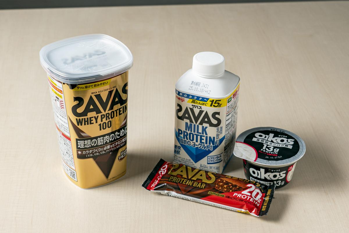 粉末プロテインは1回分で20〜30g以上のタンパク質を摂取できる商品が多い。一方、コンビニで売られているドリンクタイプは1本あたり10〜20g前後、バーやヨーグルトは10g前後。