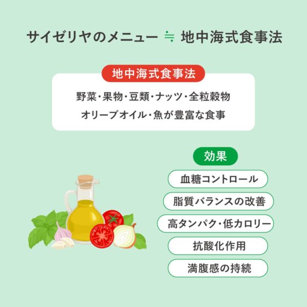 サイゼリヤのメニューは、オリーブオイル・トマト・魚介・チーズなど、地中海式食事法に近い食材構成が特徴。