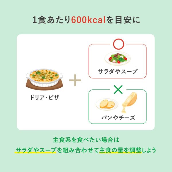 また、ドリアやピザなどの主食系を食べたい場合は、サラダやスープを組み合わせて調整するのがおすすめ。