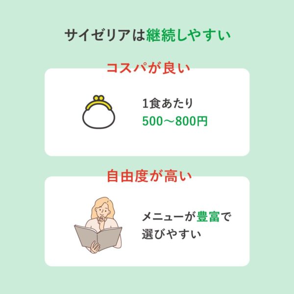 ダイエットにおいて「継続できる食生活」は最も大切。サイゼリヤはその点、1食あたり500〜800円で満足感を得られるコスパのよさが魅力。価格が高い健康食や特別メニューを継続するのは難しいが、サイゼリヤなら「外食を楽しみながら節約もできる」ため、心理的なハードルが低い。