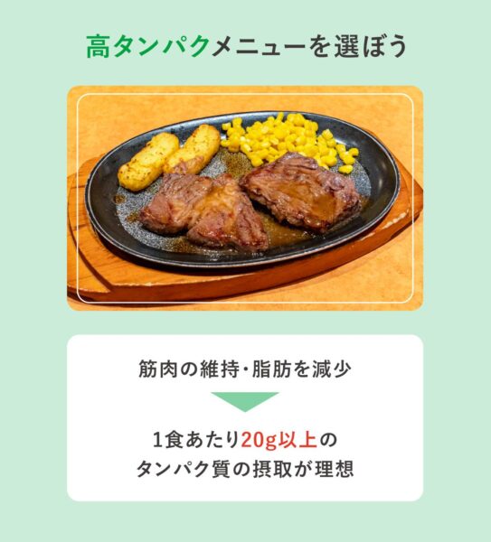 - 高タンパクメニュー(20g以上目安)を選ぶ
