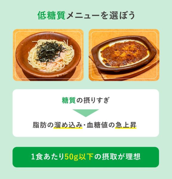 - 低糖質のメニュー(50g以下目安)を選ぶ