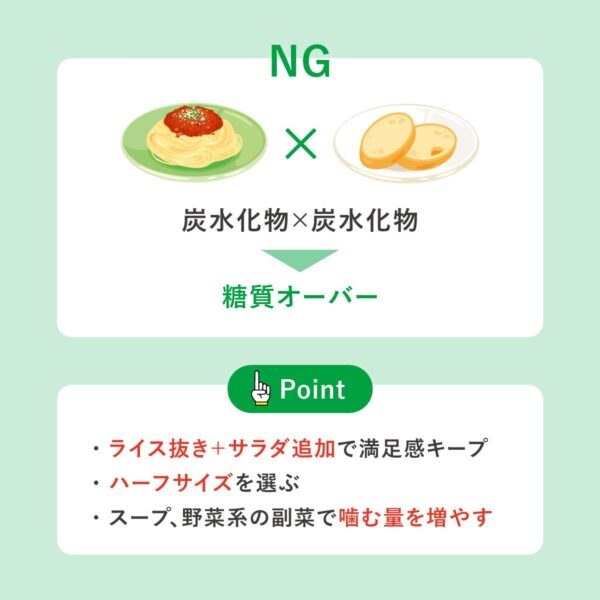 特に、パスタやドリアと一緒にパンを追加する「炭水化物×炭水化物」の組み合わせは避けたいところ。