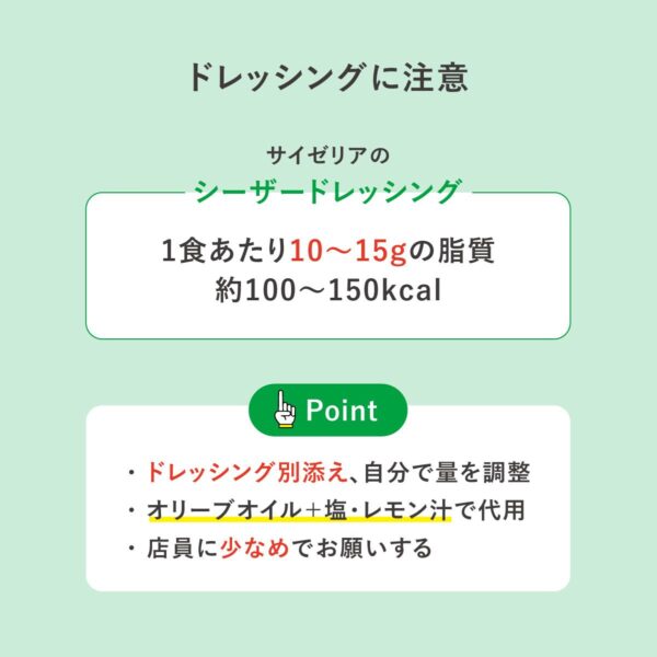 サラダはヘルシーな印象があるが、ドレッシングの選び方を誤ると高脂質メニューに変わる。サイゼリヤではシーザードレッシングなどのクリーミー系が人気だが、1食あたり10〜15gの脂質(約100〜150kcal)を含む場合がある。