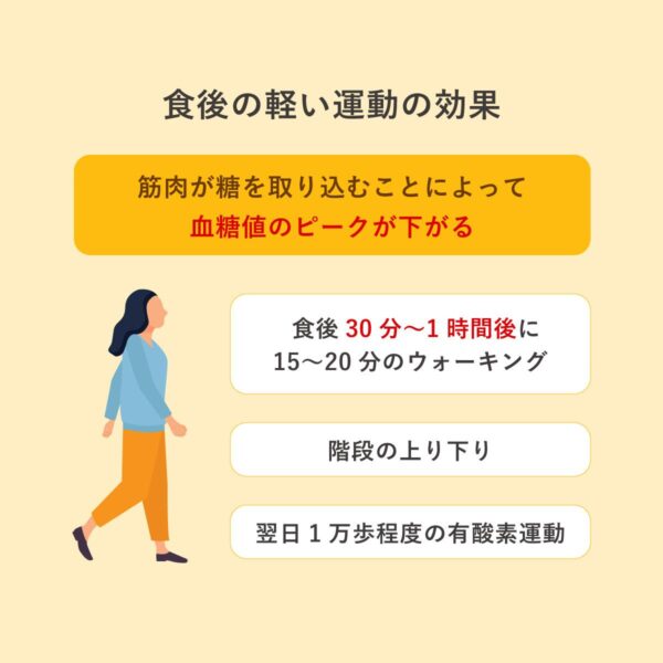 - 食後30分〜1時間後に15〜20分のウォーキング