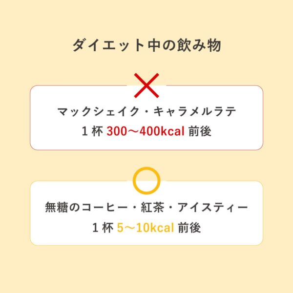 どうしても甘い飲み物を楽しみたいときもありますが、ドリンクは「見えないカロリー」になりやすいので無糖のコーヒーや紅茶を選んだ方が安心です。