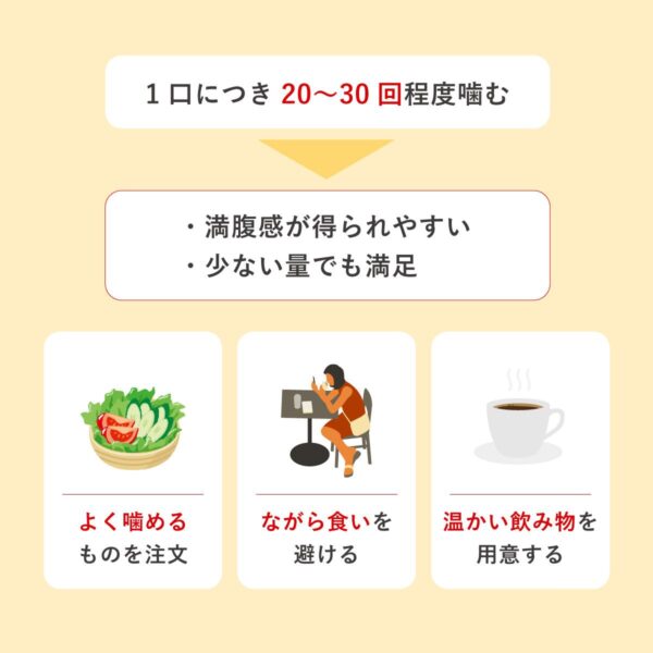 - ながら食いを避ける/・口に運ぶごとに一度置く/・温かい無糖飲料でペースを落とす