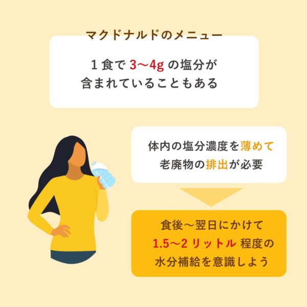 マクドナルドは塩分が多くなりやすい。食後はしっかりと水分をとり、体内の塩分濃度を薄めて老廃物の排出を促す。