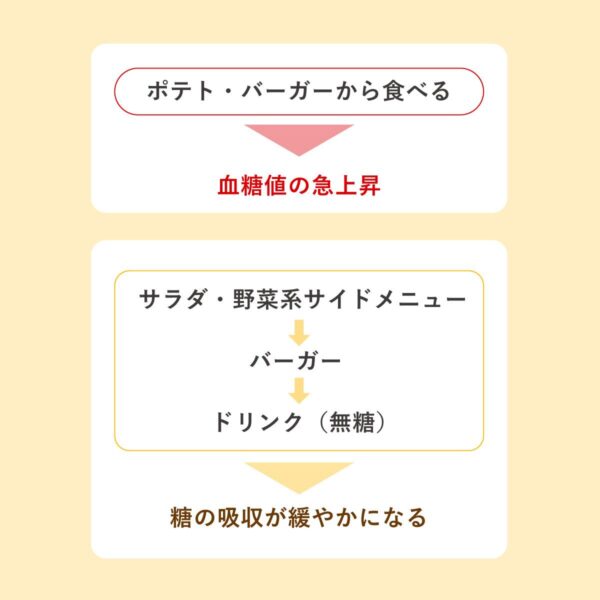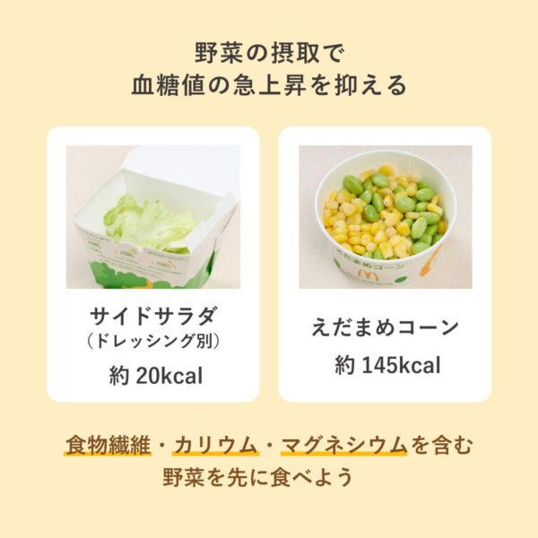 血糖値の急上昇を防ぐために、食事の順番を意識することが大切。ポテトやバンズ(パン)から食べ始めると血糖値が急激に上がりやすい。一方で、サイドサラダやえだまめコーンなどの野菜から食べると糖の吸収が緩やかになる。