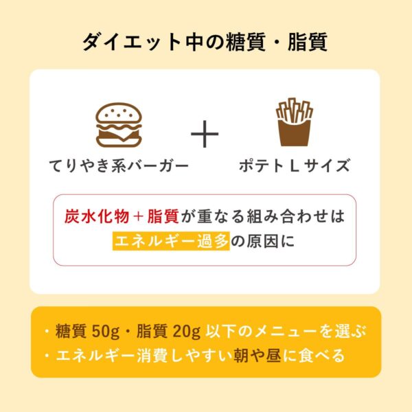 マクドナルドのメニューは糖質と脂質が高いものが多い。そのため、「炭水化物+脂質が重なる組み合わせ」を避けることが重要。たとえば、てりやき系バーガーやポテトLサイズは、糖質60g超・脂質40g超となりやすく、エネルギー過多の原因になる。