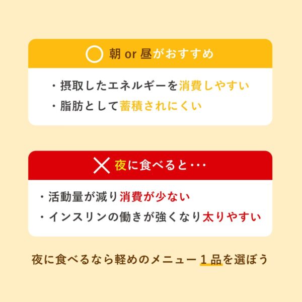 朝や昼に食べることで、摂取した糖質を活動の燃料として使いやすくなります。どうしても夜に食べる場合は、糖質や脂質を控えめにし、スープやサラダを組み合わせて全体量を調整しましょう。