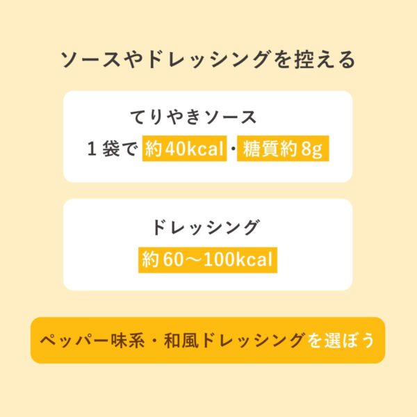 ソースやドレッシングは、味の決め手になる一方で糖質や脂質を増やす落とし穴にもなります。できるだけ「和風テイストのドレッシング」などシンプルな味付けのものを選ぶ、または半分だけ使うなどで調整しましょう。
