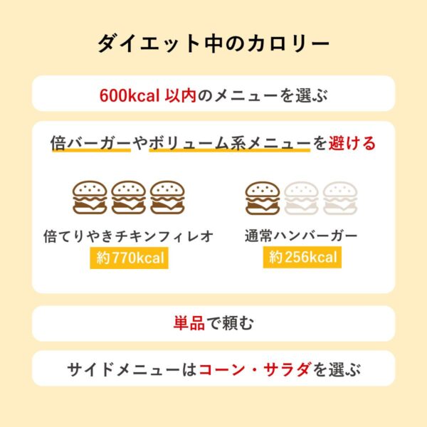 ダイエット中は、まず「倍バーガー」や「ボリューム系メニュー」を避けることが基本。たとえば、倍てりやきチキンフィレオは約770kcalと、通常のハンバーガー(約256kcal)の約3倍のカロリーを含む。