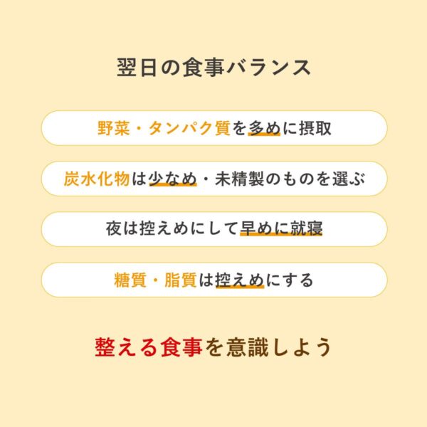 翌日は「整える食事」を意識。外食で不足しがちな野菜・タンパク質・食物繊維を中心に取り入れ、糖質・脂質は控えめに。