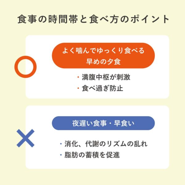 夜遅くの食事や早食いは、消化・代謝のリズムを乱し、脂肪の蓄積を促進させる。とくに夜は代謝が低下するため、できるだけ就寝の2〜3時間前までに夕食を済ませるのが理想的。