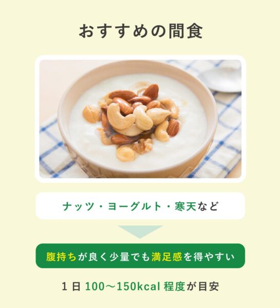 - 間食は1日200kcal以下を目安にする
