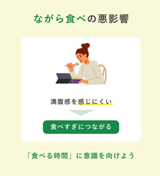 スマホやテレビを見ながら食べる「ながら食べ」は、満腹感を感じにくく、食べすぎにつながる。注意が分散されることで、味覚や食感をしっかり認識できなくなるのも原因のひとつ。