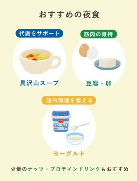 仕事で夕食が遅くなる場合は、食事の「中身」と「量」を工夫しましょう。夜遅いからといって糖質を抜いてタンパク質だけを摂るのは逆効果です。タンパク質は糖質に比べて消化がゆっくり進むため、胃腸に残る時間が長くなってしまいます。
