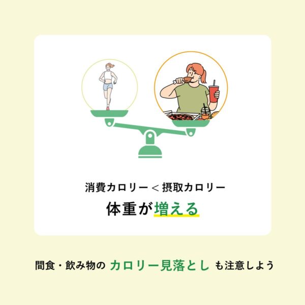 食べ物だけでなく、間食や飲み物のカロリーを見落とすケースも多く、知らないうちに摂取量が増えていることも。