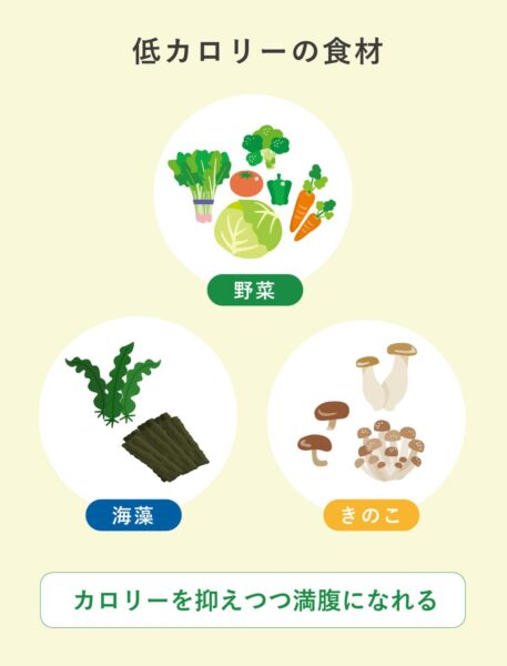 たとえば、野菜や海藻、きのこ類はボリュームがあるのに低カロリーで、満足感を得やすい。カロリーを抑えつつ満腹になれる食品を選ぶことが、太らない食事の基本。