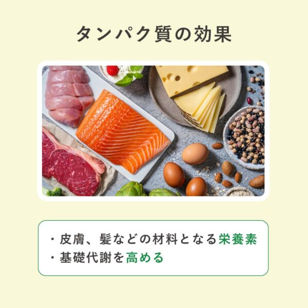 タンパク質は筋肉や皮膚、髪などの材料となる栄養素であり、基礎代謝を高める鍵でもある。筋肉量が増えることで消費エネルギーが上がり、太りにくい身体づくりにつながる。