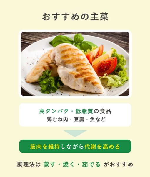 現代人の食生活ではタンパク質が不足しがちなため、意識的に摂取することが大切。鶏むね肉や豆腐、魚、卵などを毎食に取り入れるとよい。