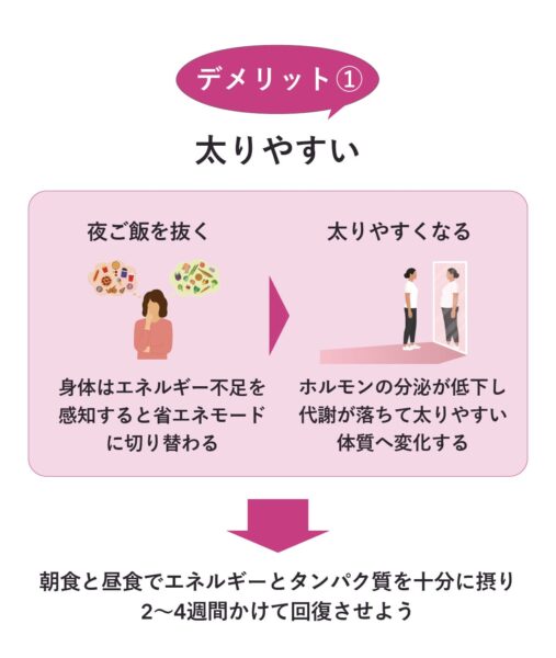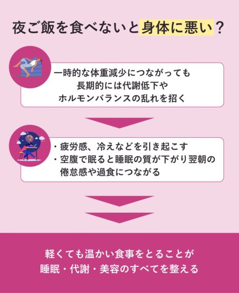 夜ごはんを抜くことは、一時的な体重減少につながっても、長期的には代謝低下やホルモンバランスの乱れを招き、身体に負担を与えるリスクが高い。