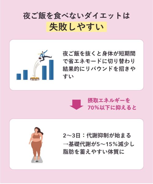 夜ごはんを抜くダイエットは一見効果的に見えても、体は短期間で「省エネモード」に切り替わり、結果的にリバウンドを招きやすい方法。