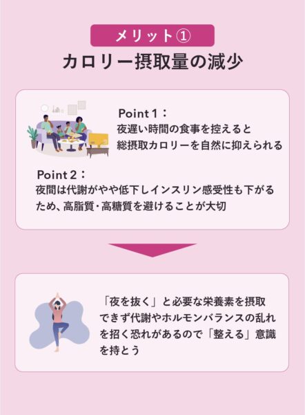 夜遅い時間の食事を控えると、総摂取カロリーを自然に抑えられる。夜間は代謝がやや低下し、インスリン感受性も下がるため、高脂質・高糖質を避けることが重要。